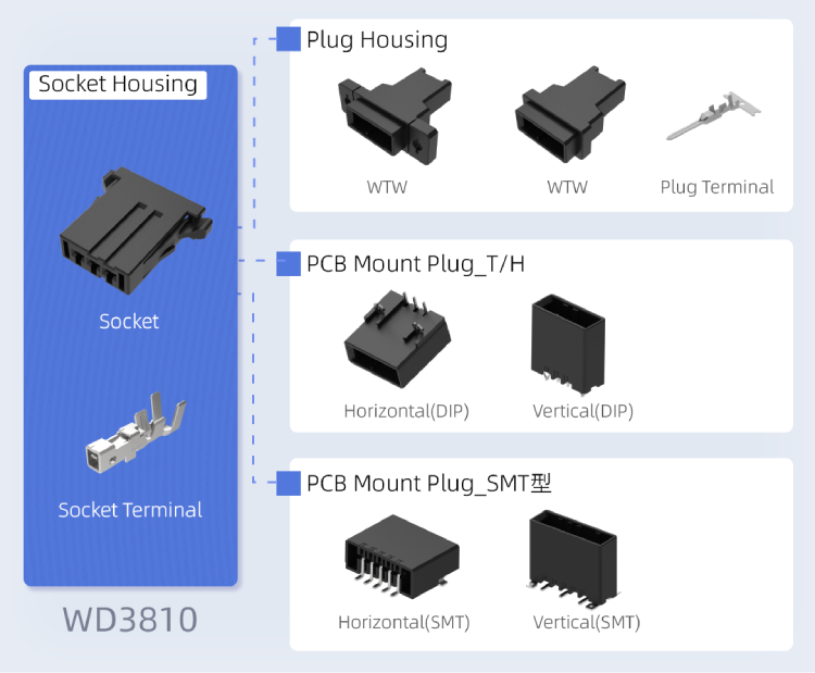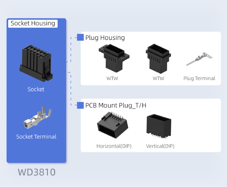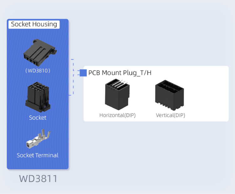 WD3810 和 WD3811 系列是線對板和線對線連接器。這些連接器具有緊湊的 3.81 mm 間距,提供垂直和水平電纜出口方向,旨在適應高密度 PCB 布局,促進設備小型化。